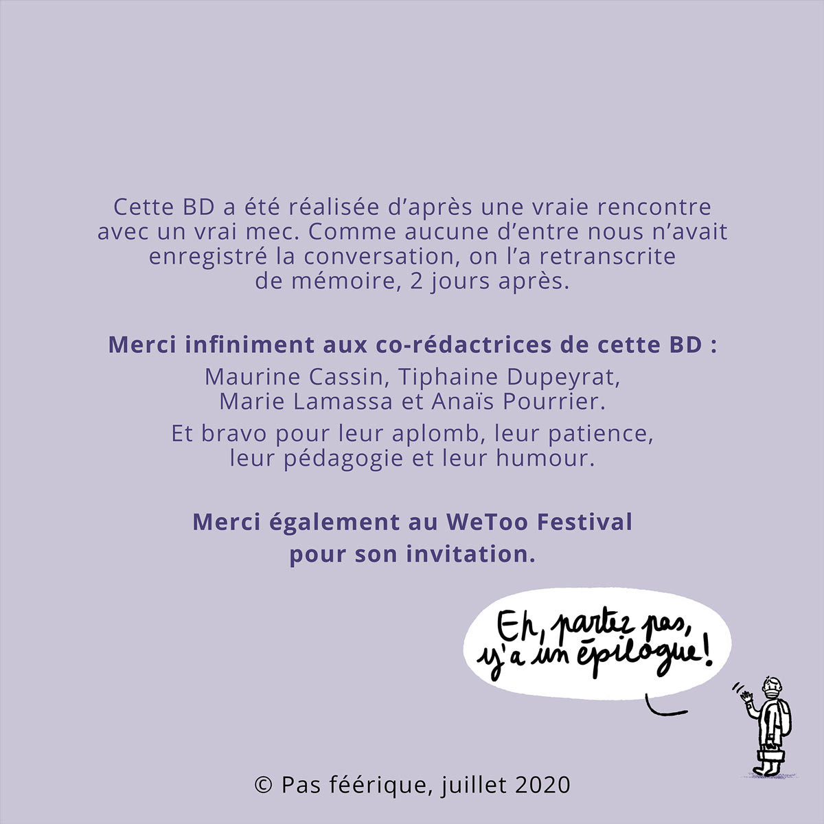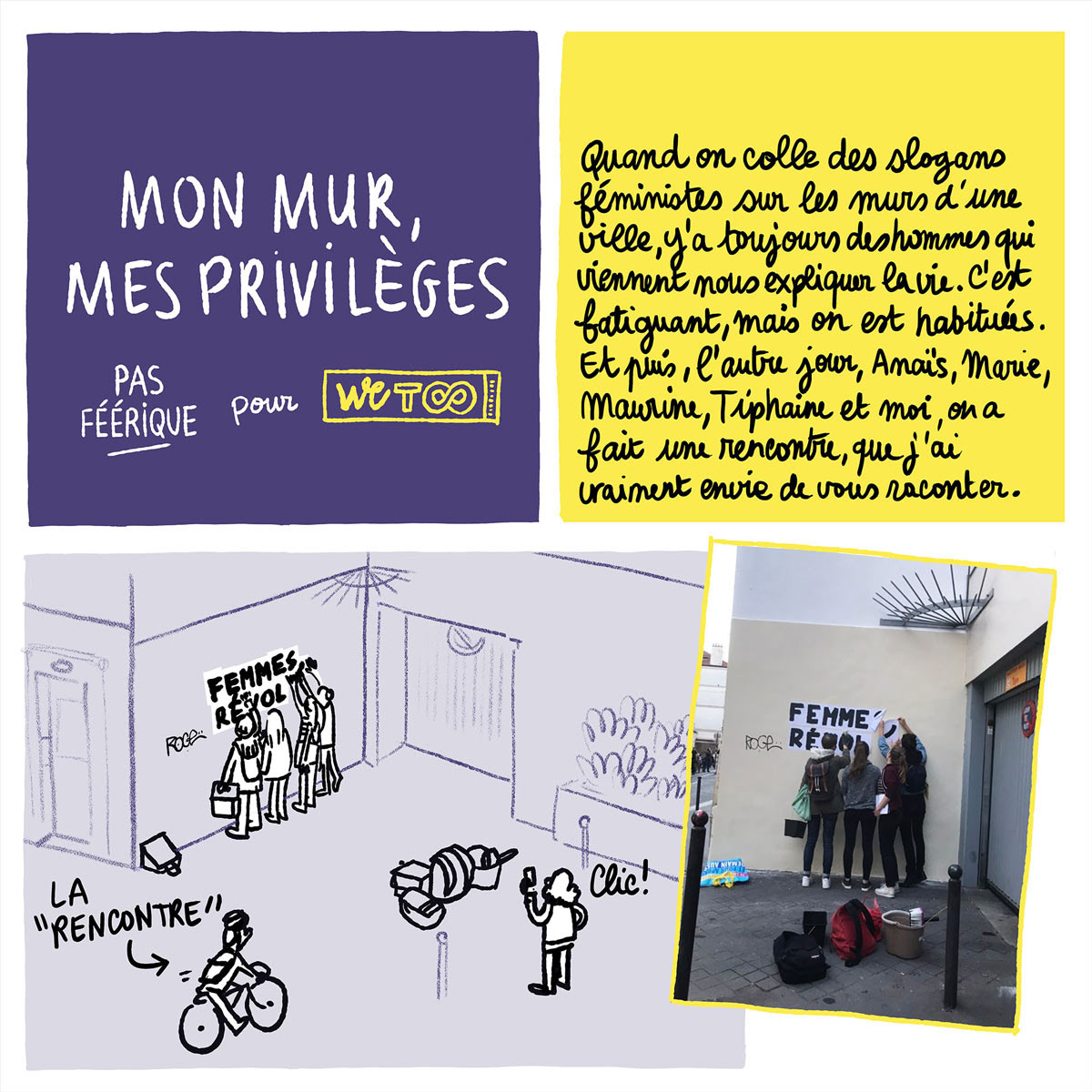 WeToo Festival, le festival inclusif, féministe et familial, m’a proposé pour sa première édition en 2020, de publier sur ses réseaux sociaux une création spécialement réalisée pour son public, ça a donné ma première (et à ce jour ma seule) BD.